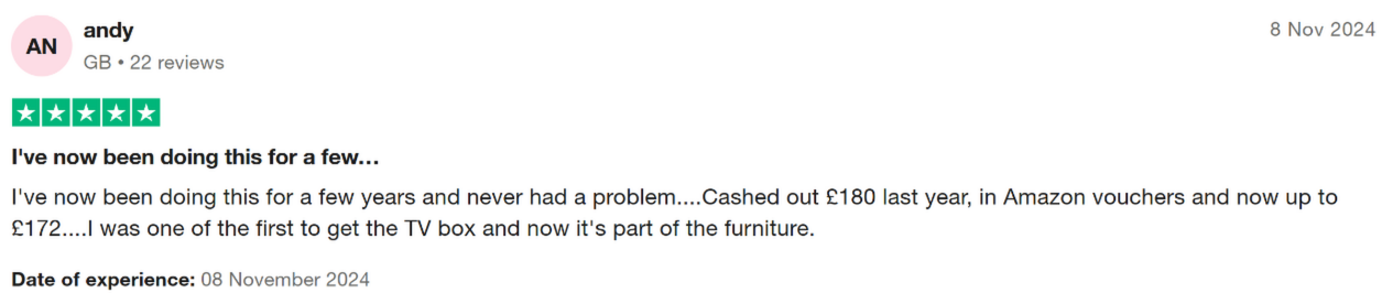 There are many reviews of people complaining about terrible customer service, and not being able to access their rewards or remove the software. For those who do seem to be enjoying it are content with ~£10 a month in vouchers. More than I expected, but still about 25 orders of magnitude away from the price of your privacy.